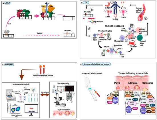 Schematic illustration of pathogenesis and characterisation of immunogenomic biomarkers in blood. (A) Deficiency in mismatch repair (dMMR) occurs when the microsatellite (MS) indel is not repaired by MMR genes. (B) LS, which occurs due to dMMR. When MS indels are not repaired in LSVH, frameshift neopeptides are formed and accumulate on the cell surface and in the bloodstream as neoantigens. These neoantigens trigger immune responses that accumulate in the circulation and infiltrate the neoplasm during early carcinogenesis. (C) Immune cells (including pro-inflammatory and checkpoint molecules) in blood and tumour-infiltrating cells correlating with different neoplasm/tumour stages (D) Immunogenomic biomarker analysis to detect cellular and acellular immune components in blood. Biomarker profiles correlated with clinical parameters in digital pathology results for cancer diagnosis and prognosis assessments.