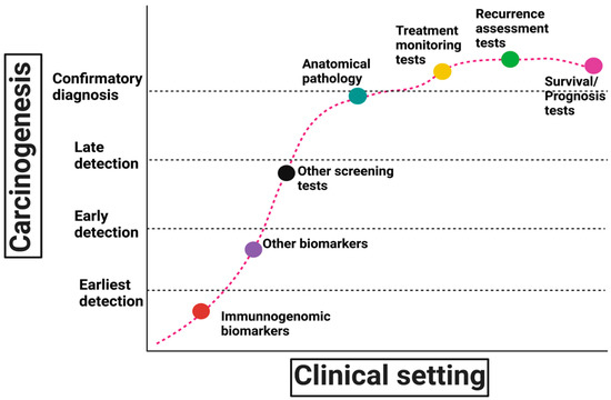 In a previous study, healthy LSVH and LS patients with CRC were shown to have an FSP-specific effector T cell population in peripheral blood [36]. Several neoantigens from genes with high mutation frequency that showed immunogenic properties in vitro were also found in healthy LSVH. The immune responses may suggest a pathological tumour stage in LSVH [65]. In addition, the burden of blood immune responses may correlate with cancer initiation in the earliest stages for clinical applications of immunogenomic biomarkers [29] (Figure 2). Since immunogenomic biomarker profiles may correlate with clinical parameters and pathology outcomes for cancer diagnosis and prognosis, this implies that immune responses may serve not only as a predictor but also as a means to intervene in cancer development [29,66] (Table 1).