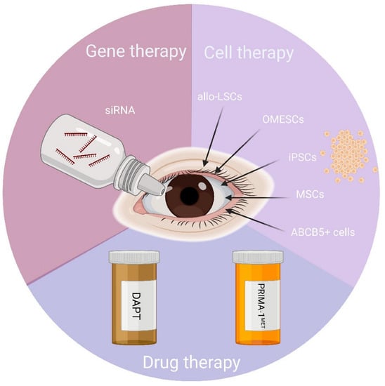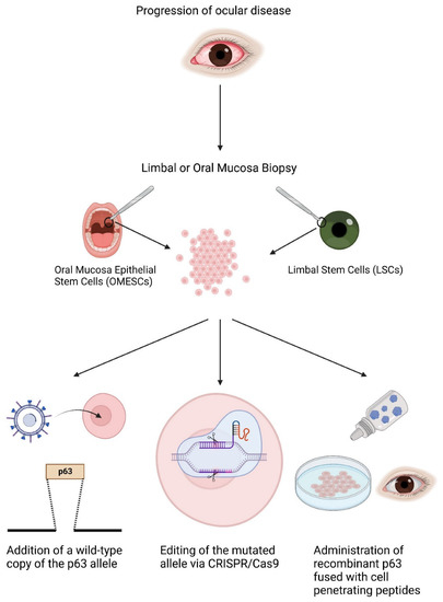 As corneal transplantation showed not to lead to any benefit in patients with EEC syndrome, different approaches have started to be developed with the aim of correcting the genetic mutations in the p63 gene, replenish the pool of stem cells or correct/bypass the genetic defect through drugs. Such innovative strategies are described below and are briefly summarized in Figure 3.