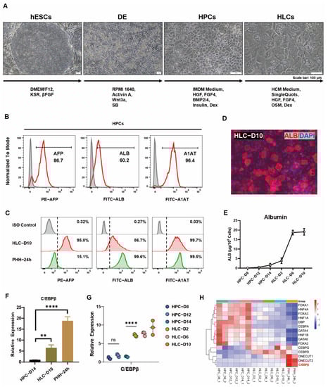 Human pluripotent stem cells (hPSCs), including human embryonic stem cells (hESCs) or human iPS cells (hiPSCs), can be induced to form hepatocyte-like cells (HLCs) in a step-by-step process in vitro [,]. In our previous study, hepatocytes could be differentiated from hESCs by induction via sequential stages []. Briefly, hESCs mainly underwent three stages to differentiate into hepatocyte-like cells (HLCs), and the resulting HLCs showed typical polygonal characteristics in morphology (Figure 1A). To determine the process of differentiation, crucial markers were used to examine each stage. Flow cytometry results showed that hESCs specifically expressed stem cell markers OCT4 and SSEA4, DE cells co-expressed markers SOX17 and CXCR4 (Figure S1A,B), and HPCs expressed hepatocyte markers AFP, ALB, and A1AT (Figure 1B). In HLCs, the expression of AFP, ALB, and A1AT was further enhanced, especially the ALB, a marker indicating cell maturity; both expression and secretion were significantly increased at the maturation stage (Figure 1C–E). However, there is still a significant difference in the expression level of ALB and ASGPR1 compared with primary hepatocytes (Figure 1C and Figure S1D). The expression of these specific markers during each stage of differentiation was also verified by quantitative PCR (Figure S1C).