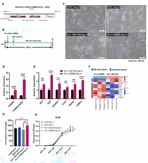 Enhanced expression of C/EBPβ promoted hepatic differentiation. (A) Schematic illustration of lentivirus vectors with overexpression of C/EBPβ. (B) Lentivirus vector-mediated overexpression of C/EBPβ by the administration of DOX during the hepatic differentiation. (C) Representative images of cell morphologies under different treatments, dense areas of cells are indicated by yellow arrows. (D) The overall C/EBPβ expression and exogenous C/EBPβ expression after the transduction with PLV-C/EBPβ virus and DOX administration (1 μg/mL). (E) Relative expression analysis of hepatocyte genes including AFP, ALB, ASGPR1, A1AT, HNF4A, and CEBPα in HPCs transduced with PLV-Vector or PLV-C/EBPβ on day 14. (F) Heat map visualization of RNA-Seq data indicated that selected bile duct genes and hepatocyte genes were differentially expressed between HPCs transduced with PLV-Vector or PLV-C/EBPβ on day 14. (G) Cell numbers were counted in each group in (C) and compared between different treatments. (H) ALB secretion was determined from the supernatants of HPCs with different treatments at different time points during the differentiation. Data represent mean ± SEM with p-values indicated when significant. p < 0.05 *; p < 0.01 **, p < 0.001 ***.