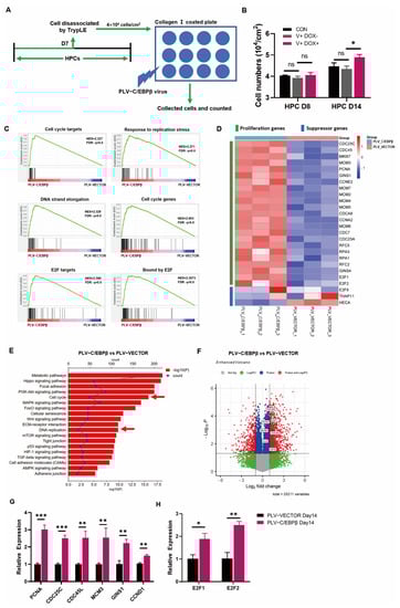 The overexpression of C/EBPβ promoted the proliferation of HPCs. (A) The diagram shows that cells were disassociated by TrypLE at HPC D7 and then seeded at 4 × 104 cells/cm2 on collagen type I coated plates. Simultaneously, PLV-C/EBPβ virus was administrated. Subsequently, cells were disassociated again and counted at HPC D8 and HPC D14, respectively. (B) Cell numbers were determined by cell counts for HPC on day 8 and for HPC on day 14. (C) GSEA results showed that cell cycle and E2F targets related genes were significantly enriched in HPCs transduced with PLV-C/EBPβ on day 14 when compared with those transduced with PLV-Vector on day 14. (D) Heat maps of selected proliferative genes and suppressor genes were differentially expressed between HPCs transduced with PLV-Vector or with PLV- C/EBPβ on day 14. (E) The KEGG pathways for the differentially expressed genes between HPCs transduced with PLV-Vector or with PLV- C/EBPβ on day 14. The principal pathways were the cell cycle and DNA replication. (F) Volcano plots showed significant changes in cell-cycle-related genes between HPCs transduced with PLV-Vector or with PLV- C/EBPβ on day 14. Volcano plot showed −log10 (p-value) on the y-axis versus log2 (fold change) on the x-axis. Each point represented a different gene. (G,H) Relative expression of proliferative genes, including PCNA, CDC25C, CDC45L, MCM3, GINS1, and CCND1 (F) and E2F genes, including E2F1 and E2F2 (H) in HPCs transduced with PLV-Vector or with PLV- C/EBPβ on day 14. Data represent mean ± SEM with p-values indicated when significant. p < 0.05 *, p < 0.01 **, p < 0.001 ***, ns, not significant. Data are the three samples per group.