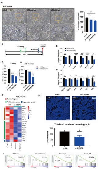 It has been proved above that the overexpression of C/EBPβ facilitated hepatic differentiation and accelerated the proliferation of HPCs. In order to further confirm the regulatory characteristics by C/EBPβ, siRNA (C/EBPβ)-mediated gene silencing of C/EBPβ in HPCs on days 7 and 12 were performed, respectively (Figure 4A). Total RNAs were collected 2 days after transductions with siRNAs at two time points, and subsequently, qRT-PCR was performed. On day 9 (2 days post gene silence on day 7), despite C/EBPβ knockdown, there was no significant down-regulation of hepatocyte genes such as HNF4A and AFP, except the expression of ALB showed was slightly decreased (Figure S4B). Consistently, there was no significant difference in cell morphology (Figure S4A). However, on day 14 (2 days post gene silence on day 12), the cell morphology was changed, cell density was decreased, and the decline of tight junctions in the cells transduced with si-C/EBPβ when compared with those in cells transduced with si-NC (Figure 4B). Obviously, with the efficient knockdown of C/EBPβ on day 14 (Figure 4C), the secretion of ALB was reduced robustly (Figure 4D). qRT-PCR results revealed that hepatic-related genes, including AFP, ALB, ASGPR1, A1AT, HNF4A, and C/EBPα were significantly down-regulated (Figure 4E). In the aforementioned results, the overexpression of C/EBPβ could significantly promote cell proliferation. Those results inspired us to determine if the expression of proliferation-related genes was affected during the C/EBPβ knockdown. As expected, the expression of proliferative genes CDC25C, CDC45L, and MCM3 was significantly down-regulated, and the transcription factor E2F2, which positively regulates proliferation, was also significantly down-regulated (Figure 4H). Moreover, heat map visualization of RNA-seq data showed that the expressions of hepatocyte genes and proliferative genes were significantly down-regulated after the C/EBPβ knockdown (Figure 4F), and GSEA results showed that gene sets related to MYC targets, cell-cycle literature, mitosis targets, and E2F binding were significantly enriched in Si-NC control group (Figure 4I), indicating that the knockdown of C/EBPβ negatively regulated cell-cycle-related pathway genes. Moreover, KEGG pathway enrichment analysis also exhibited that the cell-cycle pathway was enriched by si-NC than those by si-C/EBPβ (Figure S4C). Additionally, cell number was significantly decreased when the knockdown of C/EBPβ by siRNA also occurred in the fetal liver cell line LO2 cells (Figure 4G and Figure S4D). These results demonstrated that the knockdown of C/EBPβ significantly inhibited the differentiation, proliferation, and cell-cycle progression in HPCs, and also revealed that C/EBPβ was essential for hepatic differentiation and proliferation.
