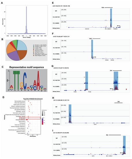 C/EBPβ promoted the expression of proliferative genes by binding to promoter regions. (A) CUT&Tag data analysis for peak summit of relative genes at location map, the abscissa was the distance between peak summit and TSS site, and the ordinate was the number of peaks. (B) Pie chart of peak distribution on gene functional elements. (C) Top scoring and representative motif sequence of C/EBPβ binding sites. (D) KEGG enrichment bubble diagram to show the first 20 pathways with the smallest q values, pathway shown as the ordinate and rich factor shown as the abscissa (the number of differences in this pathway divided by all the numbers). The size indicated the number; the redder the color, the smaller the q value. (E–I) The peaks of individual proliferative genes, including CDC25C, CDC45L, PCNA, CDC7, and E2F2, were enriched in the transcriptional regulatory regions of their respective genes, and the peaks of some genes were enhanced after overexpression of C/EBPβ.