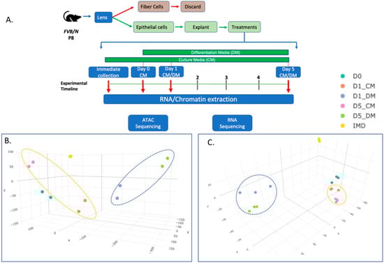 To analyze how the process of in vitro culture with and without the addition of bovine vitreous changes chromatin accessibility and gene expression in lens epithelial explants, we harvested lens epithelia from postnatal day 8 (P8) mice and explanted the epithelium in a culture dish supplemented with either culture media (CM) or differentiation media (DM). Following lens explant culture, samples were harvested at five specific time points for the collection of chromatin and RNA. These were (A) immediately after collection of the epithelium (IMD), (B) after 24 h in CM (Day 0), (C) after an additional day in CM (D1_CM) or DM (D1_DM), (D) after an additional (relative to Day 0) 5 days in CM (D5_CM) or DM (D5_ DM) (Figure 1A). Our experimental design consists of many variables that can affect both chromatin organization and gene expression. These include: (i) the trauma induced by the physical removal of the epithelium and the establishment of in vitro culture, best represented by the D0 treatment; (ii) the time in culture, represented by the D1 and D5 samples and (iii) differential effects of unsupplemented culture medium and the addition of vitreous, represented by the differences between the CM and DM treated samples. We reasoned that day 0 (D0) would best reflect immediate changes resulting from in vitro culture, while D1 would reflect immediate differences resulting from the addition of vitreous in the DM condition. In previous experiments in neonatal rat lens epithelial explants, immunologically detectable β-crystallin expression was evident after five days of 50% vitreous treatment [].
