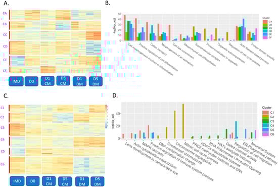 Clustering of differentially accessible regions and differentially expressed genes reveals a distinct signature of chromatin landscape and transcriptome as a function of time and culture conditions. (A) K-mean clustering was performed on all DARs across all fifteen pairwise comparisons (IMD vs D0, IMD_vs_D1_CM, IMD_vs_D5_CM, IMD vs D1_DM, IMD vs D5_DM, D0 vs D1_CM, D0 vs D5_CM, D0 vs D1_DM, D0 vs D5_DM, D1_CM vs D5_CM, D1_CM vs _D1_DM, D1_DM vs D5_DM, D1_CM_vs_D5_DM, D1_DM_vs_D5_CM, D5_DM vs D5_CM) by the criteria log2 fold change ≥ 1.5 and adjusted p-value (p-adjust) of ≤0.05 (n = 129,635 DARs), resulting in six clusters. (B) The bar chart displays select gene ontology terms associated with each cluster for ATAC-seq. The negative log10 of the p-value for each selected GO term is plotted on the y-axis, with each cluster represented by a different color. (C) K-mean clustering was performed on all DEGs across all fifteen pairwise comparisons by the criteria log2 fold change ≥1.5 and adjusted p-value (p-adjust) of ≤0.05 (n = 9044 DEGs), resulting in six clusters. (D) Bar chart displaying the significance (−log10 p-value was plotted) of DEGs for selected GO terms associated with each cluster represented by different colors.
