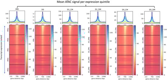 To discern where changes in the chromatin landscape occur relative to genes, the accessible regions identified by ATACseq were annotated using CHIPseeker. CHIPseeker categorizes the accessible regions as associated with promoters, introns, exons, untranslated regions (UTRs), or intergenic. These regions are further broken down as proximal promoters (within 1 kb of the TSS), intermediate promoters (within 1–2 kb of the TSS) and distal promoters (within 2–3 kb of the TSS), first exon, other exon, first intron, other intron, 5′ untranslated region (5′ UTR), 3′ untranslated region (3′ UTR), downstream intergenic (within 300 kb of the 3′UTR), and distal intergenic (>300 kb of the 3′UTR) regions. We observed that the proportion of accessible chromatin regions corresponding to promoters decreased with time in DM-treated samples, while the proportion of distal intergenic accessible regions increased with time, relative to the IMD samples (Figure 4). In contrast, the CM-treated samples exhibited the opposite accessibility profile, with increased proximal promoter accessibility and decreased distal intergenic region accessibility with time relative to the IMD samples (Figure 4). We observe the same phenomenon if we focus only on the DARs between the CM- and DM- treated samples for each day (Figure S4). Again, the number of accessible promoters for CM media increased from 615 on D1 to 5973 on D5 (9.7 fold) whereas those in the DM explants increased from 1260 on D1 to 4054 on D5 (3.2 fold). However, the non-promoter accessible regions for CM-treated explants increased from 2442 on D1 to 16,954 on D5 (6.9 fold) and in the DM-treated explants the number of accessible non-promoter regions increased from 6950 on D1 to 20,493 on D5 (2.9 fold). Overall, DM treatment of lens epithelia leads to a less substantial increase in both promoter and non-promoter accessibility with time relative to the lens epithelial explants cultured in CM.