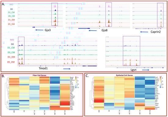 Fiber cell genes are active in D5 samples whereas epithelial cell genes are downregulated in DM samples. (A) Genomic browser view display of Gja3, Gja8, Caprin2, Tmod1, and Lgsn with normalized counts for ATAC-seq in the coverage tracks above. The dotted line represents the area of accessibility in promoter regions. (B) The z-score heatmap displays RNA-seq expression values for fiber cell-specific genes. (C) The z-score heatmap displays RNA-seq expression values for epithelial cell-specific genes.