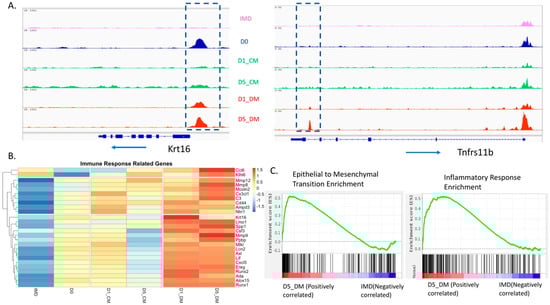 Immune response and epithelial to mesenchymal transition were observed in D5_DM samples compared to any other condition. (A) Genomic browser view display of Krt16 and Tnfrs11b with normalized counts for ATAC-seq in the coverage tracks above. The dotted line represents the area of accessibility in promoter regions. (B) The z-score heatmap displays RNA-seq expression values for immune response-related genes. (C) Gene set enrichment analysis (GSEA) was performed on normalized RNA-seq expression values from IMD and D5_DM samples. The vertical black lines represent the gene in the query list, whereas the green line represents the enrichment score for each gene (vertical black line). D5_DM dataset (represented with a red scale with red being D5_DM and blue being IMD) is enriched for epithelial to mesenchymal transition and inflammatory response. The normalized enrichment score for Epithelial to Mesenchymal Transition and Inflammatory Response is 1.29 and 1.25 respectively.