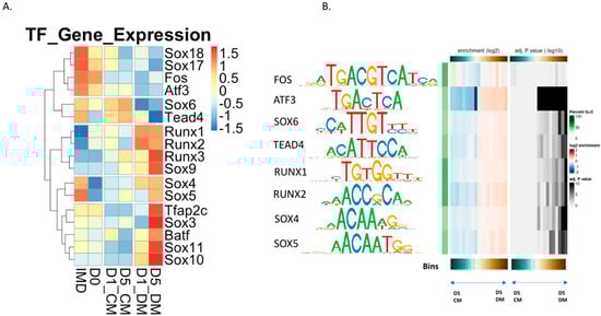 We identified a total of 148 transcription factor motifs, using a significance cutoff of (p < 0.00005), within DARs of the DM-treated explants. Of these, a total of 24 and 57 motifs were enriched in the D1_DM and D5_DM non-promoter regions, respectively and 22 and 45 motifs enriched in the D1_DM and D5_DM promoter regions, respectively (Figures S10 and S11). A total of 18 of the 148 motifs were enriched in all the conditions (Figure S12). To prioritize the biological significance of these predicted transcription factor binding sites, we compared the list of 148 motifs with the transcription factors that exhibited differential expression in the DM-treated samples. This narrowed down the transcription factor transcripts to a list of 6 that were down-regulated and 11 that were up-regulated in DM (Figure 7A). Among the 6 down-regulated transcription factor genes, three were members of the Sox gene family (Sox6, Sox17 and Sox18). The other three were Fos, Aft3 and Tead4. Members of the Sox gene family were also prominent in the up-regulated transcription factors (Sox3, Sox 4, Sox5, Sox9, Sox10 and Sox11), as were all three members of the Runx family (Runx1, Runx2 and Runx3). The remaining two up-regulated transcription factor genes were Tfap2c and Batf. Of the transcription factor genes up-regulated in DM, only Sox4 and Sox5 exhibited high expression in the IMD (native lens epithelium).