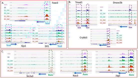 We again utilized monaLisa to annotate the positions of the motifs for the nine transcription factors that were differentially expressed in the DM treatments, and significantly expressed in the adult human lens, in the DARs between the CM- and DM-treated samples. We then searched to determine if these annotated motifs were present in the promoter regions of genes characteristically expressed in lens fiber cells or lens epithelial cells (Figure 8, Table S9). We found several TEAD motifs in gene promoter regions, including those for Foxe3, Gja1 and Dll1 (Figure 8A) genes that are primarily expressed in lens epithelial cells. We also found SOX and RUNX motifs in the promoters of several genes including Tmod1, Dnase2b and Crybb3 (Figure 8B), and Slc2a3, Nav3 and Jag1 (Figure 8C), respectively; all genes expressed predominantly in lens fiber cells.