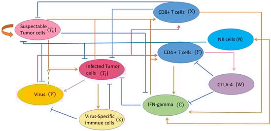 We formulate a simple ODE model to investigate the treatment of murine model of malignant melanoma B16-CD2 using OVT and anti-CTLA-4 [5]. The goals of the proposed model are to predict: combining oncolytic virotherapy with immune checkpoint modulators would reduce tumor burden by direct cell lysis and stimulating anti-tumor immunity as described in [5]. The model is constructed to describe the interactions between tumor populations, virus population, tumor-specific CTL response, NK cells, virus-specific immune populations, tumor suppressive cytokine IFN-, and the effect of immune checkpoint inhibitor CTLA-4. We consider separately the average temporal changes in the uninfected tumor size () and infected tumor size (). For the immune response, we model the evolution of effector cells CD8+ T () and CD4+ T () cells, the population of co-inhibitory receptor CTL-associated antigen 4 (CTLA-4) molecules () expressed by the CD4+ T cells and CD8+ T cells. The specific or non-specific attack of NK cells during oncolytic virotherapy is specified by the variable (). To model the evolution of CD4+ T cells, we focus on the effector role of CD4+ T cells. In fact, CD4+ T cells can kill cancer cells through cytokines and chemokines they produced even in the absence of CD8+ T cells and NK cells [21,22,23,24]. Since the level of tumor suppressive IFN- is investigated in mice treated with OVs and aCTLA-4 in [5] and tumor eradication or recrudesced after initial regression was found in mice lacking of IFN- recipient [25], the effect of IFN- () is considered within the model. We model the virus population () and the total number of anti-viral immune cells () to describe the immune responses to viral infection. The time unit is a day. The cell population has the unit of number of cells while oncolytic virions have the unit of PFU. The cytokines and immune checkpoint have the units of pg/mL and number of molecules, respectively. Prior to the model introduction, we describe the assumptions considered for each equation in the full model. These assumptions are depicted schematically in Figure 1. The summary of model state variables with their respective definitions are presented in Table 1.