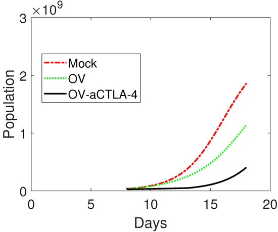 Validation starts from the case of no treatment. Our simulation results show that the tumor grows up to on day 18 without any treatment. Without any treatment, the tumor size is approximately in Engeland et al. on day 18 [5]. For treatment with OV alone, our numerical simulation shows that, if oncolytic viruses are injected into the mice when the tumor reaches an average volume of cells, the tumor reaches cells on day 18 after 5 days of treatment on day 8 as shown in Figure 2. Notice that the average tumor size is approximately cells on day 18 in Engeland et al. if monotherapy OV is administered into mice [5]. For treatment with OV-aCTLA-4, if oncolytic viruses together with rate of blockade of CTLA-4 are implemented on day 8 post-implantation and holds for 5 days, the tumor size is cells on day 18. See Figure 2. Note that the tumor size is around cells on day 18 in Engeland et al. if mice are treated with combination therapy [5]. From Engeland et al. and our simulation results, tumor volumes on day 15 after implantation revealed a significantly lower tumor volume in mice treated with OV-aCTLA-4 compared to mock. It reveals that treatment with OV led to a delay in tumor progression. However, reduced tumor volumes at early time points did not prolong overall survival in mice treated with OV-aCTLA-4 from Engeland et al. [5]. From Figure 2e of Engeland et al., the survival rate is zero or close to zero for mice treated with OV-aCTLA-4 on day 30 post-implantation. Our simulation results also show that, with OV-aCTLA-4, the tumor will grow to cells on day 30 post-implantation.