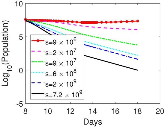 Comparison among numerically simulated dynamics of susceptible tumor cells for OV-aCTLA-4 treatment on day 18 post-implementation with various amounts of oncolytic virus. The initial condition is as in Figure 2. The level of oncolytic virus is represented by s as indicated in the figure. The treatment started on day 8 post-implantation as the tumor size reaches and lasted for 5 days. The same CTLA-4 blocking rate as in Figure 2, , is applied to OV-aCTLA-4 treatment. Other parameter values are listed in Table 3.