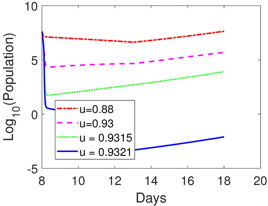 Comparison among numerically simulated dynamics of susceptible tumor cells for OV-aCTLA-4 treatment with various blockade rates of CTLA-4 on day 18 post-implementation. The initial condition is as in Figure 2. The various blockade rate of CTLA-4 is represented by u as in the figure. The therapy is administered on day 8 and holds for 5 days. The same dosages of oncolytic virus as in Figure 2, , is applied to OV-aCTLA-4 treatment. Other parameter values are given in Table 3.
