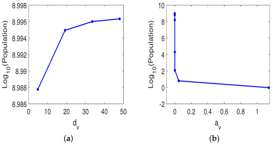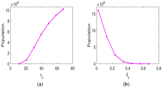 Particularly, we are interested in the role of oncolytic viruses on the treatment success. To study this effect, we implement different global sensitivity analysis by varying only those parameters associated with the OVs while keeping all other parameters fixed. This simulates an experiment of mice with comparable similar tumors and immune response but treated with various characters of viruses. We realized that the most two significant oncolytic virus-related parameters are the killing rate of virions by innate immune cells, and the proliferation rate of immune cells due to OVs. Figure 8 shows that the PRCCs for and were and , respectively. It indicates the strong correlation between these two parameter values and the post-treatment susceptible tumor cell population. The left plot in Figure 9a illustrates the tumor size as a function of killing rate of virions by innate immune cells, . With the same treatment protocols used in Figure 2, but if is increased to , , or , the susceptible tumor size gradually increases to , , or , respectively on day 18. If reaches the upper feasible value, 48, in Table 3, the susceptible tumor size grows up to . This strong correlation reflects the fact that host immune resistance is a major obstacle to intravenous delivery of OVs. Particularly, NK cells are known to indiscriminately attack both uninfected and OV-infected tumor cells rapidly [33,49]. This rapid clearance, however, may halt the desired spread of OVs and hence diminish overall OVT efficacy. Consequently, NK cell response should be minimized in order to allow viruses to replicate sufficiently [50,51]. This result is consistent with preclinical and clinical studies [17].
