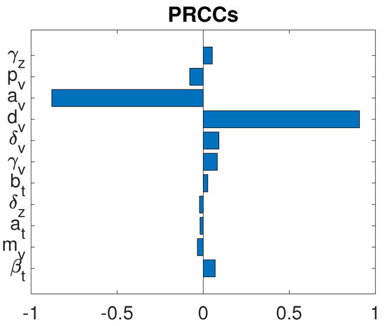We start by performing global sensitivity analysis of mono-therapy of OVT and also of combined treatment of OVT and anti-CTLA-4 to replicate in silico of a virtual experimental trial with 500 different mice. Sensitivity analysis is used to identify primary parameters that influence treatment efficacy. The majority of range of parameter values are estimated based on one over ten to twice the baseline values as in [27], and otherwise using estimates in the literature when available. The range of values of each model parameter is shown in Table 3. We perform sensitivity analysis using partial rank correlation coefficient (PRCC) analysis and Latin hypercube sampling (LHS) [47,48]. The sensitivity indices of the PRCC vary between –1 and , which measure nonlinearly but the strength of monotonic relation between output variables and parameters of interest. The global sensitivity analysis is obtained at the endpoint days. This, in particular, is correspondent to 18 days post-implantation, in agreement with the model validation. Note that the dummy parameter does not belong to the model parameters. The model parameters with sensitivity indices less than or equal to that of the dummy parameter are considered not significantly different from zero [47].