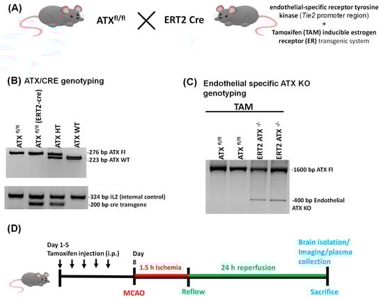 It has been shown that ATX is essential for embryonic development and vessel formation, as ATX-deficient mice die at embryonic day 9.5 (E9.5) due to vascular defects []. To study the cell-specific role of ATX, we created tamoxifen-inducible endothelial-specific ATX mice. This mouse escapes embryonic lethality, as ATX is knocked out in adulthood. Previously, we have shown in vivo that the level of LPA was increased in the vasculature following ischemic stroke [] and also in vitro that ATX was elevated with oxygen–glucose deprivation in mouse brain microvascular endothelial cells []. In this study, we aim to delineate the role of endothelial-specific ATX in stroke. Studying ischemic stroke in these mice will show that endothelial-specific ATX plays a major role in ischemic–reperfusion vascular permeability and stroke outcomes.
