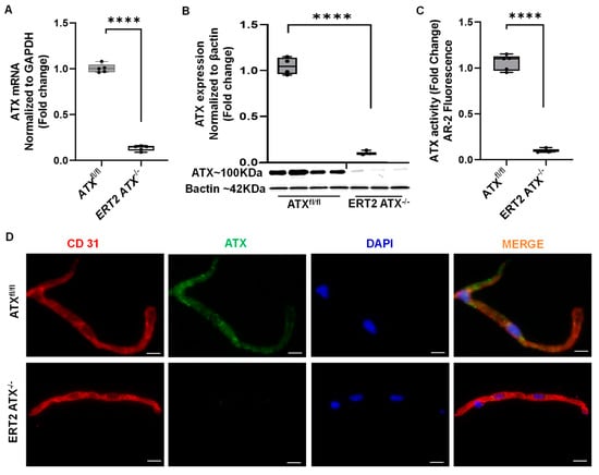 Inducible ERT2-Cre mice [] and ATX flox (ATXfl/fl) mice [] were used for breeding. The generation of the ATXfl/fl mice used in the study followed the Cre/LoxP system approach, as reported previously []. For inducible endothelial deletion, mice having both the endothelial-specific receptor tyrosine kinase (Tie2 promoter region) and the tamoxifen (TAM)-inducible estrogen receptor (ER) transgenic system were used; this generation of these mice has been reported previously []. PCR genotyping was performed to obtain inducible endothelial-specific ATX knockout mice (ERT2 ATX−/−). Three-month-old mice were injected with tamoxifen to activate the estrogen receptor.