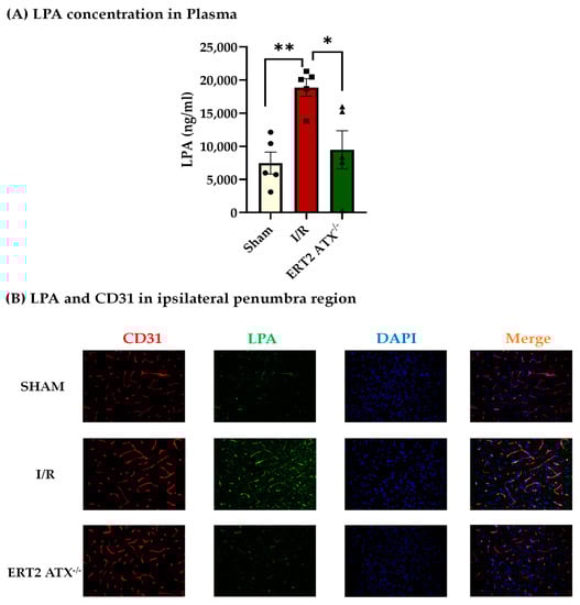 LPA decreased in ERT2 ATX−/− following I/R. (A) LPA concentration in mice plasma quantified using ELISA kit in sham, I/R and ERT2 ATX−/− mice, n = 5. (B) LPA (for lysophosphatidic acid) and CD31 (for endothelial cells/ blood vessels) immunostaining in mice brain cryosections, n = 5. LPA is labeled in green, CD31 (marker for endothelial cells) in red, and DAPI (marker for nuclei) in blue (20× magnification). All values are mean ± SEM. * p < 0.05 and ** p < 0.01 show significance compared to using ANOVA followed by the Bonferroni post hoc test.