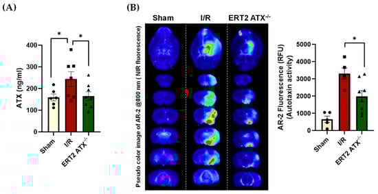 Reduced ATX and its activity in ERT2 ATX−/− following I/R. (A) ATX concentration in mice plasma quantified using the ELISA kit in sham, I/R, and ERT2 ATX−/− mice, n = 6–8. (B) Enzymatic activity for ATX measured using the AR-2 fluorescence probe and quantified as relative fluorescence units (RFU) in sham, I/R, and ERT2 ATX−/− mice brains. Pseudo-color images of the AR-2 probe at 800 nm in an infrared imager are shown as representative images for ATX activity, n = 5–8. All values are mean ± SEM. * p < 0.05 shows significance compared using ANOVA followed by the Bonferroni post hoc test.