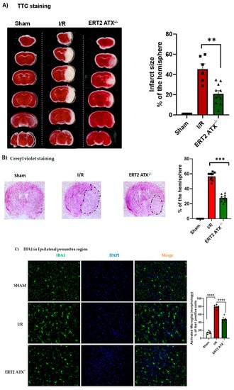 Brain tissue damage following stroke was measured using TTC staining and Cresyl Violet staining. With TTC staining, the infarct size was observed to be significantly reduced in ERT2 ATX−/− mice compared to that of the I/R mice (Figure 5A). With Cresyl Violet staining, a reduction in infarct size was also observed when endothelial ATX was deleted in ERT2 ATX−/− (Figure 5B). Additionally, the Cresyl Violet staining data suggest lesser neuronal loss in ERT2 ATX−/− mice compared to I/R mice (Figure 5B), as Cresyl Violet stains neuronal cells in the brain tissue. Reduction in the ATX and LPA levels during the pathological phases of a stroke could reduce the neuronal excitotoxicity and neuronal loss. Along with the decreased infarct size following injury, ERT2 ATX−/− mice also showed lowered inflammation observed with reduced IBA1 microglial staining in the ipsilateral penumbral region (Figure 5C). Microglial numbers were quantified morphologically (ramified microglia as inactivated and amoeboid microglia as activated).