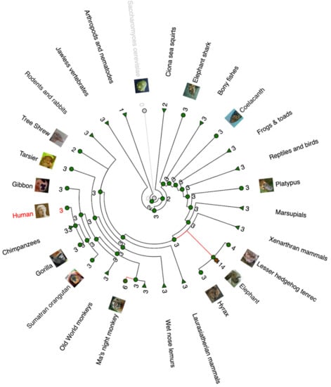 Analysis of TP53 copy numbers in multiple species can be seen in Figure 1 through a gain/loss phylogenetic tree illustration. It is obvious that most animal species have three TP53 paralogues in their genome, most likely TP53, TP63, and TP73. A remarkable copy expansion is observed in elephants and in Ma’s night monkey.