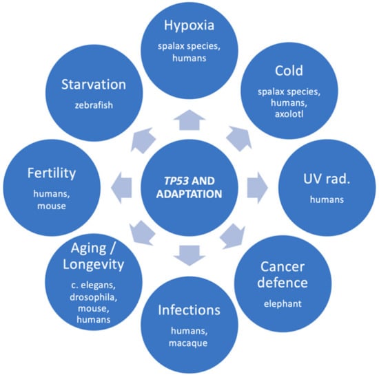 There is no doubt that TP53 promotes adaptation in many species. The adaptational role of TP53 is summarized in Figure 2. Sound examples include the TP53-R72P single amino-acid substitution in humans and the multiple TP53 copies in elephants. The obvious advantage of TP53 selection pressures is, of course, the defense against cancer. However, evidence shows that TP53 adaptive variants have been selected in multiple species for surviving under demanding conditions, such as cold, hypoxia, and probably viral infections, as well. Probably, there are many more adaptations to be discovered. High-throughput genetic methods will highly facilitate research of the next few years, and more intriguing aspects of the TP53 gene will be revealed.