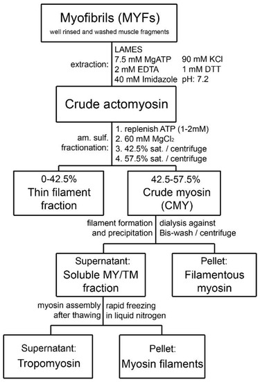 The extraction and purification of MLCK step is accomplished by including an additional washing or extraction with kinase extraction solution (KES, Figure 8) of high MgCl2 concentration during the MYF preparation. This is accomplished before the crude actomyosin step [20,37,45] and the MYF preparation can be continued by the two additional washes to remove the MgCl2 trapped in the pellet. The main reason for using a high concentration of MgCl2 is to increase the ionic strength needed for MLCK extraction and at the same time to significantly reduce the amount of the co-extracted TM. High concentrations of TM in the MLCK extracts result in high viscosity, thus precluding further purification of the kinase [24,25]. Performing the intermediate extraction of MLCK with KES results in distinct crude actomyosin and subsequent types of myosin. The content of co-purified or endogenous CaM/MLCK complex is 3–4-fold lower with the MLCK extraction step than without it [38].