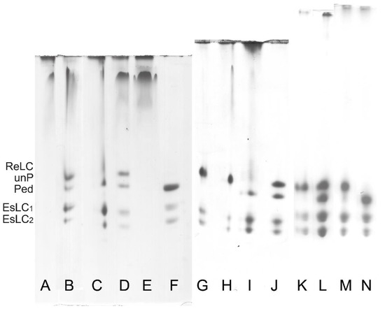 Analysis of phosphorylation levels of ReLC by UG PAGE of three different myosin preparations. As indicated by the labels on the left, the top bands correspond to unphosphorylated (unP) ReLC. The bands below the unphosphorylated bands correspond to phosphorylated (Ped) ReLC. The bottom two bands correspond to the two differently charged isoforms of EsLC, which are not phosphorylated. The first preparation (lanes A–E) was bovine tracheal smooth muscle myosin purified using the standard protocol developed for gizzard smooth muscle. The second preparation (lanes G–J) was bovine tracheal smooth muscle myosin purified using the protocol optimized for bovine tracheal smooth muscle. The third preparation (lanes K–N) was pig stomach muscle myosin purified using the protocol optimized for bovine tracheal smooth muscle. (A) Crude actomyosin. ReLC and EsLCs did not enter the separation part of the gel containing glycerol because they were not dissociated from the myosin heavy chains [29]. (B) Freshly prepared CMY supernatants. (C) CMY pelleted filaments. In lane B and C, ReLC and EsLC entered the gel but with significant smearing. (D) CMY supernatant left on ice overnight. ReLC and EsLC migrated into UG PAGE and the characteristic TM smearing band is visible at the top of the lane. (E) Supernatant of D after pelleting of the myosin filament. The only band visible in lane E is TM because the soluble TM remained in the supernatant after the removal of the myosin filaments. (F) Phosphorylated purified myosin from turkey gizzard included for comparison. (G) Freshly prepared CMY supernatant. (H) Pelleted filaments of the dialyzed CMY fraction. (I) CMY supernatant left on ice overnight. (J) Supernatant of I after pelleting of the myosin filament. Analogous purified myosin preparations were obtained from other types of smooth muscle, i.e., the antrum phasic (lanes K,L) and fundus tonic (lanes M,N) muscles of pig stomach.