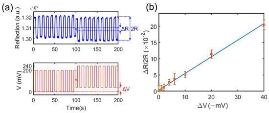 In the calibration, was varied from 0 to −40 mV, and the intensity change of the reflected light was measured to establish the relation curve. Figure 3a shows as a square wave was applied, the reflected light intensity also exhibited a square wave shape. When was varied from 0 to −40 mV, we observed a decrease in the reflected light intensity. Here, we defined R as the difference between the highest reflection light intensity and the average reflection light intensity when a square waved was applied, while was the difference between the highest reflection intensity and the lowest reflection intensity. When a was changed, an average reflection intensity deference () was observed. Figure 3b shows the relationship between the normalized reflected light intensity change () and . The error bars represent the standard variation of measured light intensity changes from 25 microelectrodes. The relation curve is linear. The correlation curve can be expressed as:
