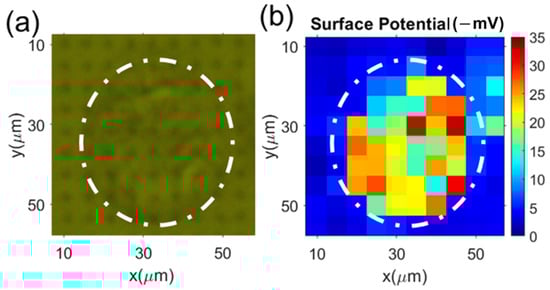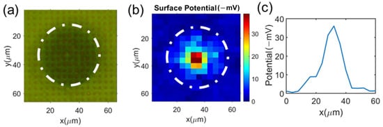 Typical results for HDFs are shown in Figure 6a, which shows the image of HDFs sitting on the microelectrode array with top illumination, while Figure 6b shows the surface potential mapping. From the mapping measurement, the average surface potential of these HDFs was −19 ± 7 mV. For the validation purpose, we also performed zeta potential measurements on the same batch of the HDFs using NanoZ, which gave the average zeta potential of −18.5 ± 2.4 mV. The mapping measurement via the microelectrode array matched well with the NanoZ measurement. From Figure 6b, we can identify the area that had a lower potential than the surrounding solution; this area matched with the actual cell area (Figure 6a) reasonably well.