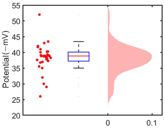 Figure 4c shows the surface potential along the centerline of the MP. The maximum electrical potential occurred at the MP’s tip area. The surface potential at the central electrode was −37 mV. We took additional measurements of 30 MPs sitting on the microelectrode surface. Because only at the tip area the measure electrical potential could represent the surface potential of MPs, for each mapping we only took the value from the central electrode (the highest value) to determine the MPs’ surface potentials. The average value of the 30 measured MP surface potentials was −38 ± 5 mV, as shown in Figure 5. To validate this measurement result, we measured the zeta potential of MPs from the same batch using the standard electrophoresis light scattering method (Nano Z, Malvern Panalytical, Malvern, England, UK); the result was −39 ± 5.41 mV. The two sets of results are consistent with each other. This test demonstrates the feasibility of mapping the surface charge of an MP or a cell with the microelectrode-ITO array.