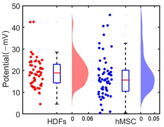Comparison of the measured surface potentials of HDFs (red) and hMSC (blue). Left of each half-part: scattered plot of the surface potentials of individual cells; center of each half-part: boxplot of the surface potential measurement of cells; right of each half-part: distribution of the surface potentials of the 60 cells of each kind of cell.