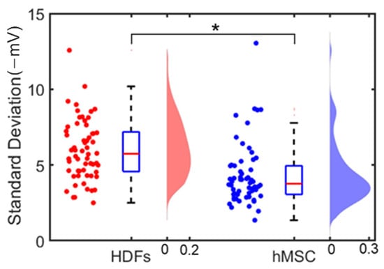 Figure 9 shows the standard deviations calculated from single cells’ surface potential distribution; each data point represents the standard deviation in surface potentials of all pixels within one cell. Sixty independent cells of each cell type were analyzed. The statistical analysis was carried out using MATLAB, and a p-value of less than 0.05 was set as a statistically significance level for the t-test. Figure 9 shows there was a distinct difference in the surface potential distribution patterns between the two types of cells: the averages of the standard deviations of HDFs’ and hMSC’ surface potential distributions were 5.9 and 4.3 (−mV), respectively. This indicates that HDFs had a less uniform surface potential distribution than hMSC had.