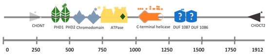 The CHD family consists of nine members (CHD1–CHD9). Their structure is characterised by two consecutive chromodomains in the N-terminal region and an SNF2-like ATP-dependent helicase domain positioned in the central region. They recognise and bind nucleosomes to contribute, in many cases, to the formation of heterochromatin typically marked by the presence of methylated histones and other repressive chromatin markers. CHD proteins can bind to methylated histones through their chromodomains and use their helicase activity to remodel the chromatin and contribute to the formation of heterochromatin, a fundamental feature of chromosomes that ensures genomic stability [8].