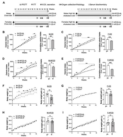 Intermittent fasting reduces body weight gain in Apoe-/- male mice fed chow diet. (A), Schematic outline of the experimental design: male or female Apoe-/- mice were divided into four groups that were assigned standard chow diet ad libitum (CD-AL group), intermittent fasting treatment of chow diet, by fasting every other day (CD-IF group) for 16 weeks, high-fat high-cholesterol diet ad libitum (HFCD-AL group), or intermittent fasting of HFCD (HFCD-IF group) for 16 weeks. Metabolic tests were performed at the indicated time, and blood and organ samples were collected from euthanized mice at the end of the treatment. (B–E) The calorie intake per mouse was calculated from the weekly calorie intake values per cage divided by the number of co-housed mice and expressed per week (left panel) and cumulatively over the 16 weeks of follow-up (right panel). Calorie intake in CD-fed males (B), CD-fed females (C), HFCD-fed males (D), and HFCD-fed females, n = 12–14 per group. (F–I) Change in body weight per week (left panel) and body weight gain after 16 weeks of treatment (right panel) in CD-fed males (F), CD-fed females (G), HFCD-fed males (H), and HFCD-fed females (I), n = 12–14 per group. Values are expressed as means ± SEM; ns: not significant; * p < 0.05, ** p < 0.01, *** p < 0.001. IPGTT: intraperitoneal glucose tolerance test, ITT: insulin tolerance test, VLDL: very low-density lipoprotein.