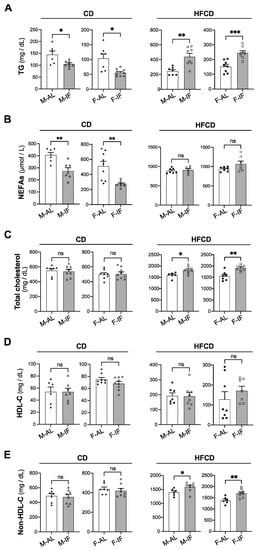 Compared to the AL control group, IF intervention in Apoe-/- mice fed CD significantly lowered the plasma levels of TG and NEFA in both sexes, while this condition did not affect total cholesterol, HDL-C and non-HDL-C levels (Figure 2A–E, left panels). Conversely, when Apoe-/- mice were fed HFCD, IF intervention favored a dyslipidemic profile in both sexes, characterized by higher levels of plasma TG, total cholesterol, and non-HDL-C and similar levels of HDL-C and FFA (Figure 2A–E, right panel).