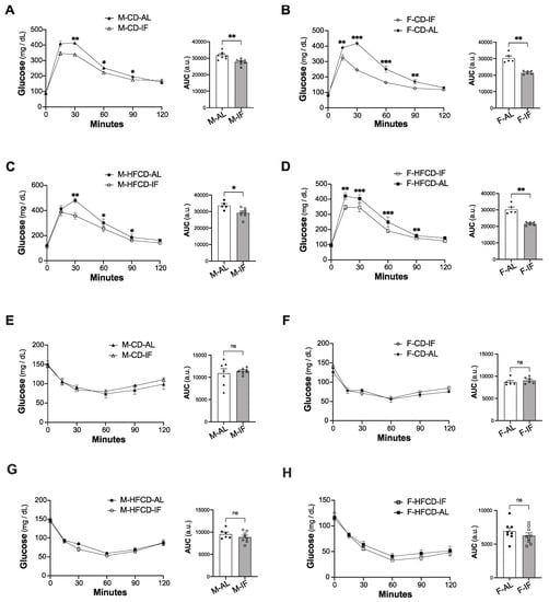 Intermittent fasting in Apoe-/- mice improves glucose tolerance. (A–D) Intraperitoneal glucose tolerance test (IPGTT). At 12 weeks of intervention, ad libitum (AL) and intermittent fasting (IF) Apoe-/- mice were fasted for 16 h and received an intraperitoneal injection of glucose (1 g/kg). Glycemia was measured at the indicated times (left panel), and the respective area under the curve (AUC) was calculated (right panel) for CD-fed males (A), CD-fed females (B), HFCD-fed males (C), and HFCD-fed females (D). (E–H) Intraperitoneal insulin tolerance test (ITT). Two weeks after IPGTT, the same mice were fasted for 5 h and received an intraperitoneal injection of insulin (0.5 U/kg). Glycemia was measured at the indicated times (left panel), and the respective area under the curve (AUC) was calculated (right panel) for CD-fed males (E), CD-fed females (F), HFCD-fed males (G), and HFCD-fed females (H). Values are expressed as means ± SEM (n = 5–9 per group); ns: not significant; * p < 0.05, ** p < 0.01, *** p < 0.001.