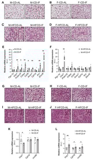 Given that IF favored a BAT-like phenotype independently of sex, we analyzed gene expression in male mice only. In support of the histological analysis, when mice were fed CD, IF induced a significant increase in the expression of browning genes in SC-AT (Figure 4E), including uncoupling protein 1 (Ucp1), PR domain containing 16 (Prdm16), and cell death-inducing DFFA-like effector A (Cidea). IF also induced a significant increase in lipolysis-related genes, including cluster of differentiation 36 (Cd36), acyl-CoA oxidase 1 (Acox1), and elongation of very long-chain fatty acids protein 6 (Elovl6), as well as acetyl-CoA carboxylase alpha (Acaca), a rate-limiting enzyme for fatty acid synthesis (Figure 4E). Interestingly, the Ucp1 mRNA expression level was dramatically upregulated by IF in mice fed HFCD (Figure 4F), indicating that IF stimulates WAT browning on top of the HFCD effect. No difference was observed between the AL and IF groups in gene expression of peroxisome proliferator-activated receptor gamma coactivator 1-alpha (Pgc1-α) or carnitine palmitoyltransferase-1 (Cpt1-α), the rate-limiting enzyme of fatty acid oxidation (Figure 4E,F).