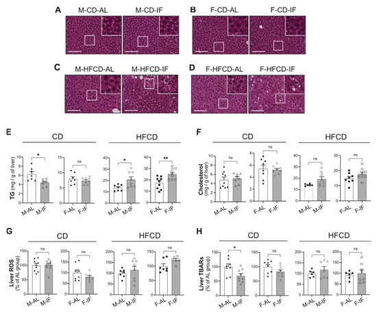 The effect of IF on hepatic lipid deposition was first examined in H&E-stained liver sections. Under CD, the histological morphology of the liver was similar between the AL and IF groups, with a normal structure of the liver cells in both groups in a sex-independent manner (Figure 5A,B). However, we found that IF significantly reduced hepatic triglyceride (TG) levels in males fed CD but not in females (Figure 5E, left panel). In contrast, in mice fed HFCD, the abundance and size of lipid droplets were higher in the IF groups than in the AL groups (Figure 5C,D). Accordingly, IF in mice fed HFCD was associated with increased levels of hepatic TG, independently of sex (Figure 5E, right panel). The hepatic cholesterol content and ROS levels, documenting oxidative stress, were similar between the IF groups and their respective AL control groups (Figure 5F,G), and the ability of IF to reduce liver TBARS, which are by-products of lipid peroxidation, was strictly limited to males fed CD (Figure 5H).