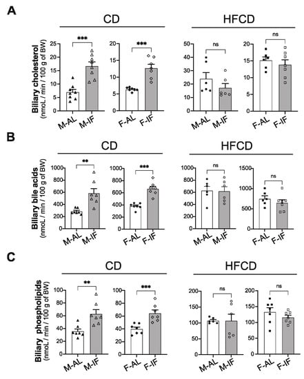 Interestingly, while we did not observe any effect of IF on plasma cholesterol levels (total, HDL, and non-HDL cholesterol) in CD-fed mice, we found that cholesterol excretion into the bile, either as unesterified (free) cholesterol or after conversion to bile acids, was increased in these mice compared to their AL control. This is in line with the increase in the expression of genes involved in the biliary excretion of cholesterol, including Abcg5/Abcg8 responsible for reducing circulating cholesterol. These data suggest that IF increases the clearance of cholesterol by reverse cholesterol transport (RCT), which is considered to be a main way for the body to excrete cholesterol [59]. We also found that the level of plasma TG was decreased by IF in CD-fed mice in a sex-independent manner. This could be explained by the observed decrease in hepatic VLDL-TG secretion. Although we did not measure lipoprotein lipase activity (LPL), the decrease in plasma TG concentration could also be attributed to an increase in LPL activity. Indeed, LPL, which is a key enzyme in lipid metabolism, hydrolyses triglycerides in circulating TG-rich lipoproteins and promotes the cellular uptake of chylomicron remnants, cholesterol-rich lipoproteins, and free fatty acids by adipose tissue and skeletal muscle [60]. Contrary to the beneficial effect of IF in mice fed CD, IF exacerbated both the plasma TG and cholesterol levels, which were increased by HFCD, and had no effect on biliary lipid secretion. We did not explore the molecular mechanisms of this effect, but we can hypothesize that IF in HFCD mice induced a decrease in LPL activity, a delay in post-prandial TG-rich lipoprotein clearance from the plasma, and/or an increase in intestinal lipid absorption.