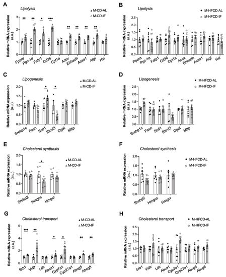 Although the levels of cholesterol content in the liver in all IF groups and the AL groups were comparable, we found that IF resulted in a decrease in gene expression of HMG-CoA synthase (Hmgs), which is an enzyme involved in cholesterol synthesis in males fed CD. Furthermore, in the same mice, IF significantly increased the expression of genes involved in cholesterol uptake by the liver, cholesterol efflux, and cholesterol bile secretion. These changes were not observed when mice were fed HFCD. These data suggest that when mice were fed CD, IF promoted an increase in cholesterol transport and excretion, while it induced a decrease in cholesterol synthesis.