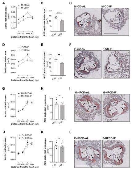 To examine the effect of the IF regimen on atherosclerosis development in Apoe-/- mice, we determined the aortic sinus plaque sizes. Considering the distance from the heart to the aortic arch, the aortic root lesions were increased in both the AL and IF groups irrespective of sex and diet (Figure 8A,D,G,J). Interestingly, when mice were under CD, IF significantly decreased fatty streak lesions in the aortic root in both males and females as demonstrated by calculation of the AUC (Figure 8B,E) and evaluated by Oil Red O staining (Figure 8C,F). However, under HFCD, the lesion area was not modified by the IF regimen (Figure 8G–L). These data suggest that IF alleviates atherosclerosis progress in Apoe-/- mice in a sex-independent manner when fed chow diet and that an atherogenic diet offsets this effect.