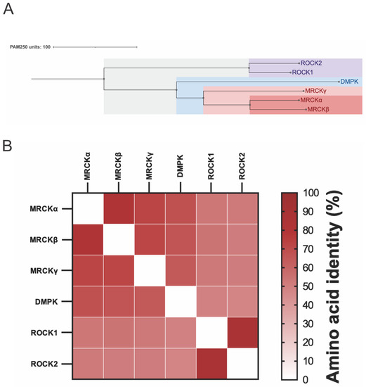 Relatedness of MRCK, ROCK, and DMPK kinases. (A). The ROCK1, ROCK2, MRCKα, MRCKβ, MRCKγ, and DMPK kinase domains were aligned using protein sequence data from UniProt [16] and ClustalOmega [17]. The results were presented using Jalview [18], and the PAM250 matrix was used to convert the similarity percentages into average distances measured to represent evolutionary distances among the proteins [19]. (B). Pairwise alignment of the ROCK1, ROCK2, MRCKα, MRCKβ, MRCKγ, and DMPK kinase domains produced percentage identity scores that highlighted the similarities between each kinase domain. These results were graphed as a heat map of their pairwise amino acid identities.