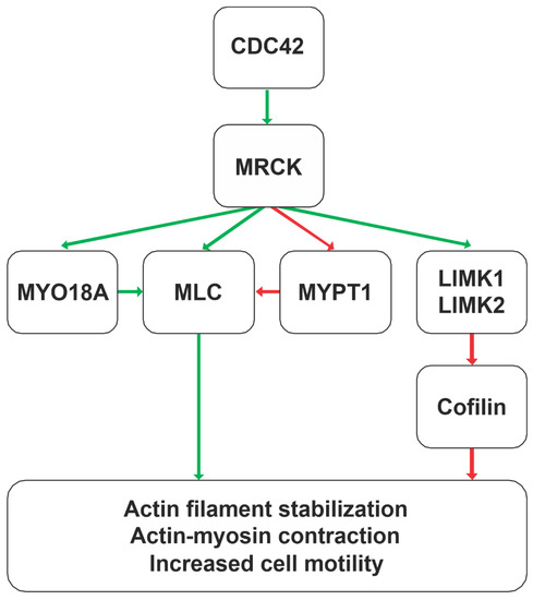 MRCK signalling pathways leading to actin–myosin cytoskeleton regulation. Acting downstream of the Cdc42 GTPase, the MRCK kinases MRCKα, MRCKβ, and MRCKγ phosphorylate substrates that ultimately lead to the stabilization of actin filaments and promotion of actin–myosin contractile force generation. These actions on the actin–myosin cytoskeleton contribute to increased cell motility.