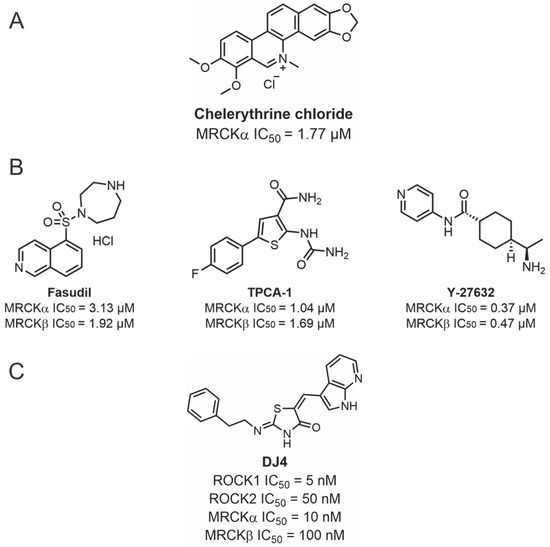 Chelerythrine chloride was first identified as an MRCKα and MRCKβ inhibitor through the screening of a commercially available panel of 159 protein kinase inhibitors at 10 µM. It was found to reduce the in vitro phosphorylation of recombinant MLC with an IC50 of 1.77 µM for MRCKα (Figure 6A) [47,48]. Although chelerythrine chloride was previously reported to be a PKCα inhibitor with an IC50 of 0.66 µM [49], no significant inhibition of seven kinases (including highly homologous kinases, such as DMPK, ROCK2, citron kinase, MLC kinase, or even PKCα) was detected. MRCK inhibition was not affected by varying the ATP concentrations, suggesting that MRCK inhibition by chelerythrine chloride proceeds through a non-ATP competitive mechanism, although the mechanism of action has not yet been determined. The treatment of cells with chelerythrine chloride led to changes in F-actin organization and inhibited cell migration, in agreement with an effect on inhibiting MRCK activity [47,50].