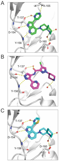 Essential interactions between an inhibitor and a kinase can be identified by investigating the binding mode via X-ray crystallography. The most optimized MRCK inhibitor to date, BDP9066, has three distinct parts: an azaindole backbone, a heterocyclic ligand, and a diazaspirocycle (Figure 7). Structural studies revealed that the 7-azaindole backbone is the hinge binder and forms two hydrogen bonds with the carbonyl of Asp154 and amine of Tyr156 (Figure 8A) [32]. Similarly, the pyridine pyrazole group in BDP5290 acts as the hinge binder, forming hydrogen bonds with the backbone of Asp154 and Tyr156 (Figure 8B) [52]. The co-crystal structure of BDP5290 with MRCKβ also shows the conservation of the inner water molecule at the gatekeeper, forming a water bridge between Thr137 and the carbonyl of the amide on BDP5290, which acts as a hydrogen bond acceptor while the piperazine faces towards the solvent (Figure 8B). The heterocyclic ligand of the second-generation MRCK inhibitors satisfies the hydrogen bonding potential of water inside the binding pocket. The pyrimidine of BDP9066 (Figure 8A) has an advantage over the thiazole ligand of BDP8900 (Figure 8C) and the chloropyrazole of BDP5290 (Figure 8B), as the second nitrogen in the ring forms a water bridge to hydrogen bond with Lys105 [31,52]. The most intriguing component of modern inhibitors is the diazaspirocycle, which is the solvent-exposed part of the molecule. The diazaspirocycle can form hydrogen bonds with water molecules due to the extensive reach and geometry of the nitrogen on the second piperidine ring.
