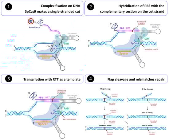 In October 2019, David R. Liu’s group released an outstanding discovery called prime editing [20]. This system can mediate targeted insertions, deletions, and all 12 possible base-to-base conversions. This mechanism makes DNA modifications with unprecedented precision and has substantial advantages over the traditional CRISPR/Cas9 and base editing systems (Table 1). Derived from the CRISPR/Cas9 system, this new technology is composed of a Cas9 nuclease fused with a reverse transcriptase (RT) at its 3′ extremity and a prime editing guide RNA (pegRNA) (Figure 1). The combination of Cas9 and RT forms the prime editor (PE). The pegRNA is composed of a spacer sequence, a primer binding site (PBS), a reverse transcriptase template (RTT), and a common region that binds to the Cas9 and the RT [19]. First, the complex binds to the DNA, guided by the spacer sequence in the pegRNA. The Cas9 recognizes a PAM and cuts 3 nt upstream. However, instead of creating a double-stranded cut, the modified H840A Cas9 from the prime editing induces a single-stranded nick [20]. Then, the PBS hybridizes to its complementary sequence located on the cut strand. Then, the RT will use the RTT as a template to transcribe the cut strand. At this point, one of the strands has a duplicated section, so the cell will have to remove one of the two sections to put back the DNA double-stranded again. The mismatch will be resolved by a 5′ flap or a 3′ flap. If a 3′ flap happens, the correction will be kept, but the editing will be lost if a 5′ flap occurs [20].