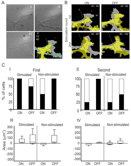 During the second stimulation, only 25% of the cells increased their growth cone area during the ON period in both the stimulated and non-stimulated quadrants. However, in the OFF period, 100% and 50% of the cells increased their growth cone areas in the stimulated and non-stimulated regions, respectively (Figure 1C-II). The median values of the growth cone area variations are the same between the stimulated and non-stimulated zones. Interestingly, during the second round of stimulation in the stimulated quadrant, a negative median value was obtained at the ON period, whereas in the OFF period, the median area variation was positive (−11.45 vs. 5.32 µm2), suggesting that a delayed effect of the laser could be present until the OFF period (Figure 1C-IV stimulated ON and OFF).